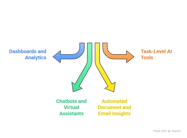 | Dashboards and Analytics AI enhances reporting with automated summaries, trend detection, and predictive insights. Leaders get clearer visibility into performance, but the outputs rarely feed directly into coordinated actions across teams or systems. | Chatbots and Virtual Assistants They handle FAQs, support basic troubleshooting, and speed up routine interactions. Useful for frontline efficiency, but they operate at the edges of the business and have limited influence on deeper operational workflows. |