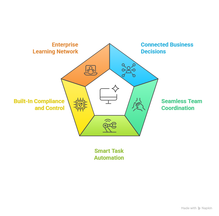 It unifies decision paths, automates cross-functional steps, and embeds intelligence and compliance directly into enterprise operations.