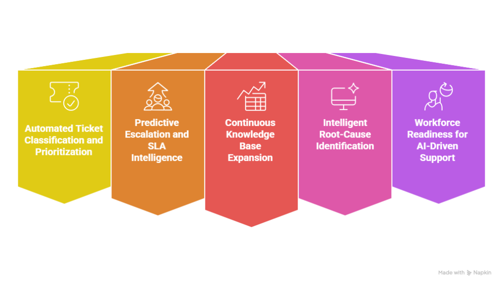 From L1 ticket automation and predictive escalation & SLA management to root-cause analysis AI, and knowledge base automation, these systems learn from patterns, correlate signals, and anticipate what comes next, turning every ticket into a data point for improvement.