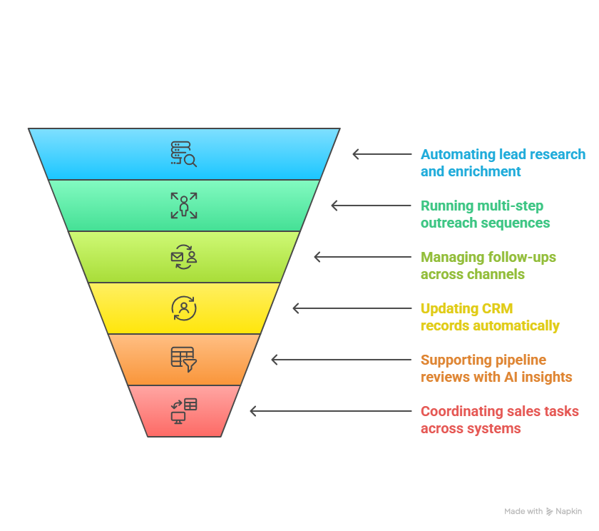 Beyond individual tools, some AI agents orchestrate tasks across CRMs, engagement platforms, and internal systems. This reduces handoffs between tools and keeps sales workflows connected end to end.