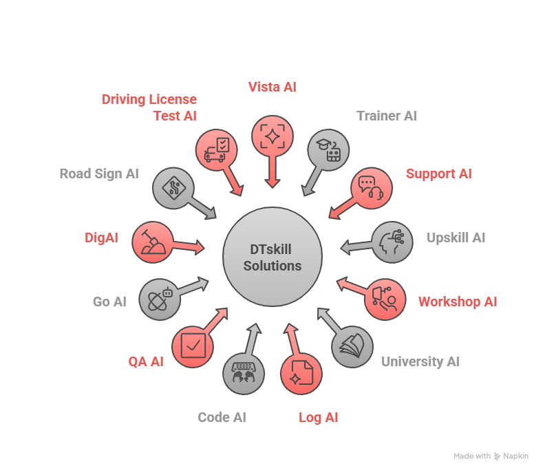 | Workforce Learning & Institutional EnablementUpskill AI, Workshop AI, University AIThese solutions apply AI to skill development, training delivery, and learning environments across enterprises and educational institutions. | Operations, Engineering & Domain-Specific ExecutionLog AI, QA AI, Code AI, DigAI, Road Sign AI, Driving License Test AIThese solutions enhance operational workflows, engineering productivity, quality processes, and specialized domain or public infrastructure use cases. |