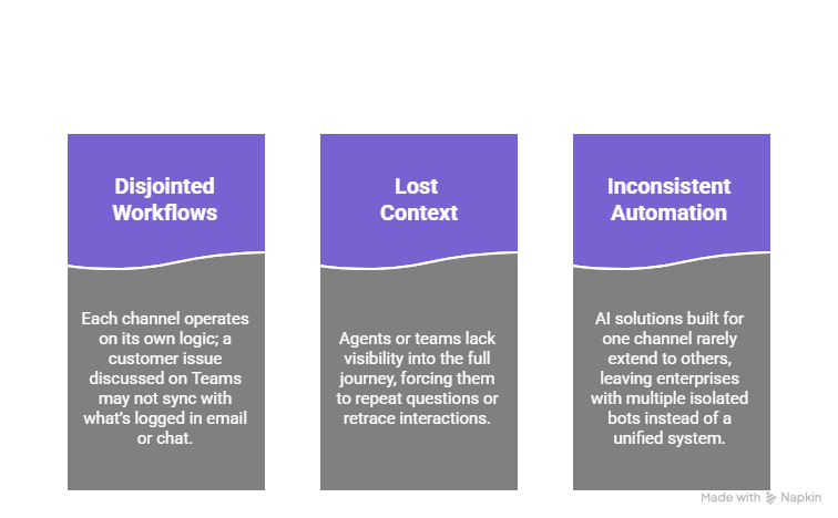 - Disjointed Workflows: Each channel operates on its own logic; a customer issue discussed on Teams may not sync with what’s logged in email or chat.