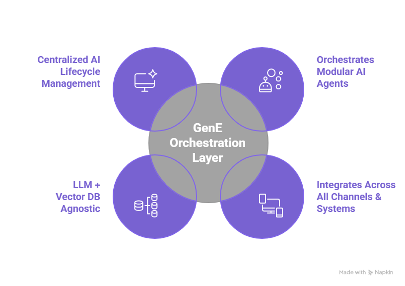 True omnichannel AI automation isn’t about adding more bots to different systems; it’s about creating a single, coordinated layer that lets them work together intelligently. That’s the role of GenE AI orchestration to unify automation, maintain context, and deliver consistency across every enterprise communication channel.