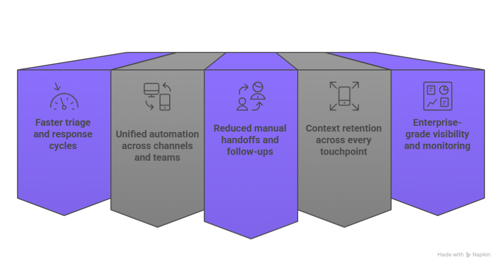 Through omnichannel AI automation, responses become faster, actions more precise, and visibility sharper. This connected structure forms the backbone of enterprise AI automation, driving scalable intelligence, effortless collaboration, and lasting operational resilience.
