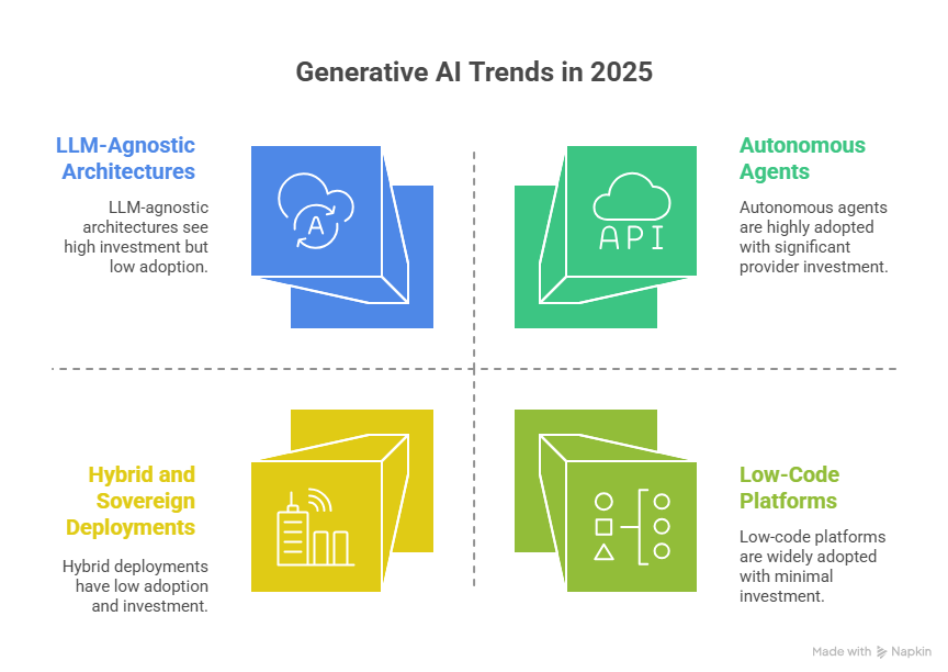 Major trends include autonomous agents, RAG pipelines, domain-specific GenAI, low-code democratization, hybrid/on-prem deployments, and governance as a differentiator.